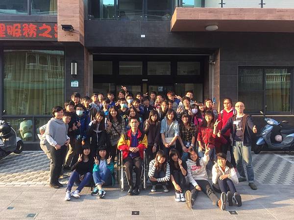 圖五:小港高中學生與高雄中學學生於志工訓練課程結束後,於橙田護理之家門口留影記念。